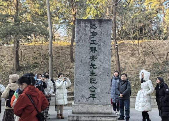在清华学姐任书漫的引领下,同学们游赏水木清华,在朱自清先生笔下的荷塘漫步,体味文学大家的幽思;在闻一多先生纪念墙下驻足,慨叹爱国学者的坚贞。大家还专程拜谒了王静安先生纪念碑,纪念碑矗立在教学楼的北方、大礼堂的西南,掩映在苍松翠柏之下,隶书碑文与陈寅恪先生所撰碑铭互为表里,在表彰先生学术成就的基础上,还定格了先生“独立之精神,自由之思想”的学者风标。朗诵碑铭,回想王国维先生的生平学问,同学们思考着学者之使命、操守,更感学术研究责任之重大、意义之深远。