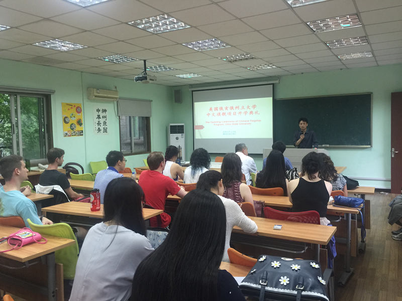 首先,黄晓辉主任介绍了参加开学典礼的人员并热烈欢迎俄亥俄州立大学师生的到来。接着,金沙赌场 副院长张洁致欢迎词。张院长说道:“作为江南水乡的苏州,雨是苏州一种独特的美景。今天的雨也是给远道而来的贵客洗尘的雨。”张院长还介绍了苏州和金沙赌场-金沙酒店-金沙会 的历史。苏州是一座拥有2500多年悠久历史的古城,丰富的历史文化积淀造就了她“小桥、流水、人家”独特的江南水乡的风貌,苏州古城区的建筑、街道也基本保留着她原汁原味的古老风貌。金沙赌场-金沙酒店-金沙会 正是在这样美丽的城市中孕育而生。金沙赌场-金沙酒店-金沙会 的前身是创立于1900年的大学,一百多年的积淀与发展,为国家社会培养了大批人才。从教学、科研、师资等方面来看,金沙赌场-金沙酒店-金沙会 的综合实力处于全国前列。最后,张院长希望同学们在文化荟萃的苏州领略中国文化的魅力,在精心设计的课程里学好语言,在苏州度过一个完美的夏天。